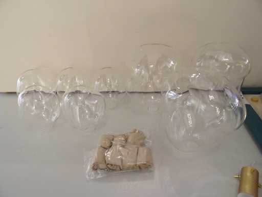 Couleur : laiton satiné, verre transparent ; Nombre de sources lumineuses : 8 ; 3x grande et 5x mini, plaque de plafond : 50x50cm, note : photo d’exemple, c’est en réalité un luminaire en laiton satiné avec des billes en verre transparent