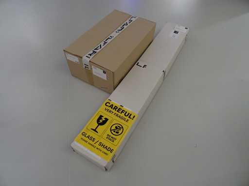 Couleur : Chrome, boules de verre blanc ; Nombre de sources lumineuses : 1 ; Note : photo d’exemple, c’est en réalité un luminaire chromé avec des boules en verre blanc ; Dimensions : Longueur : 110 cm