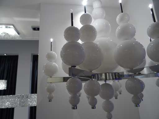 Couleur : Chrome, boules de verre blanc ; Nombre de sources lumineuses : 12 ; Taille : 115x75cm (HxDia)