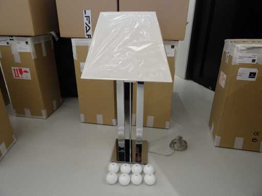 Couleur : Chrome, abat-teint blanc, boules en verre blanc ; Nombre de sources lumineuses : 1 ; Note : photo d’exemple, ce sont en réalité des boules de verre blanches ; Dimensions : Hauteur : 84 cm