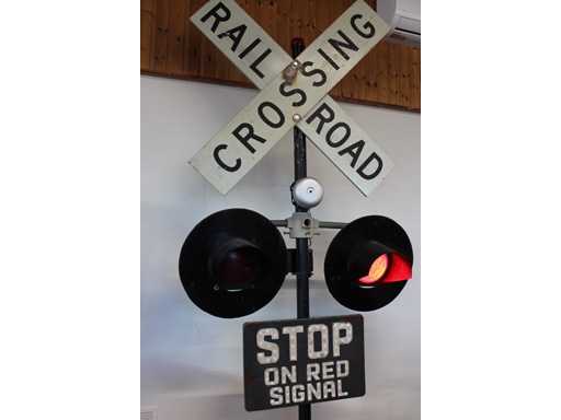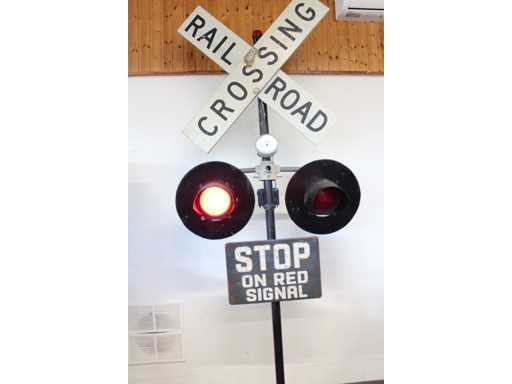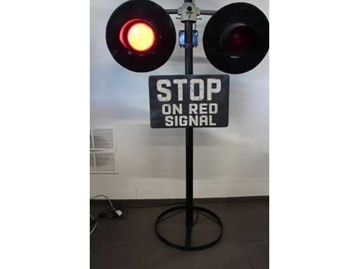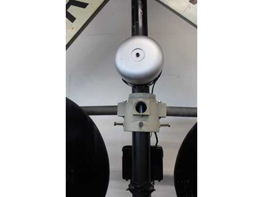 Passage à niveau authentique avec feux d’avertissement clignotants et cloche, d’environ 250 cm de haut, 220 volts