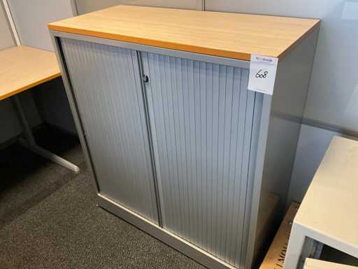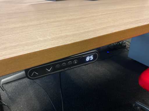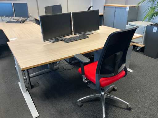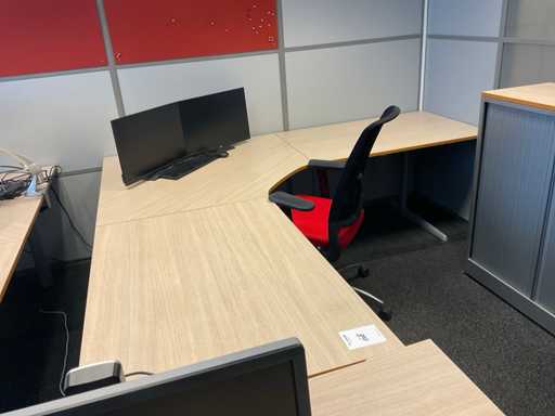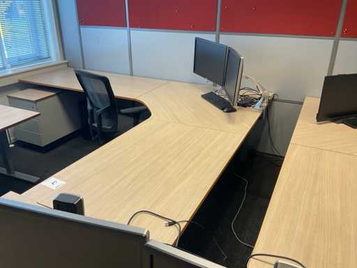 Se compose de 1 pièce : 2 bureaux d’angle avec chaise pivotante, écrans et tiroirs, 1 table de bureau réglable en hauteur électriquement avec chaise pivotante, 2 écrans et tiroirs et 1 armoire à portes coulissantes à lames