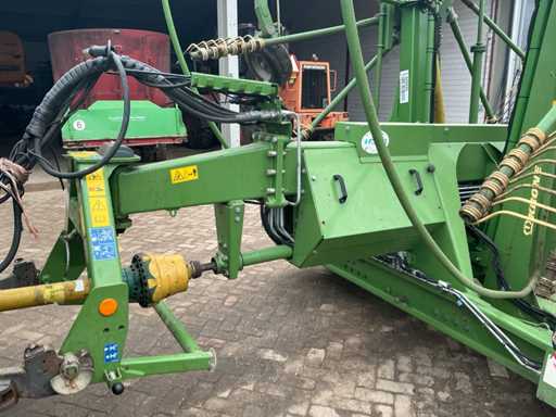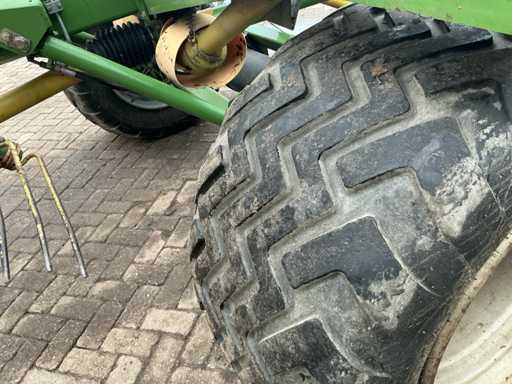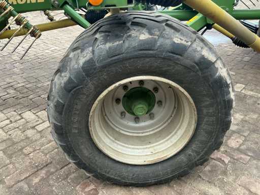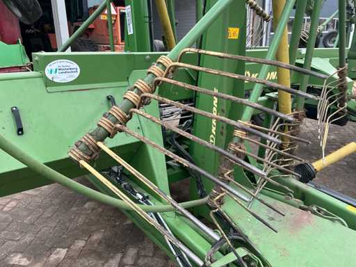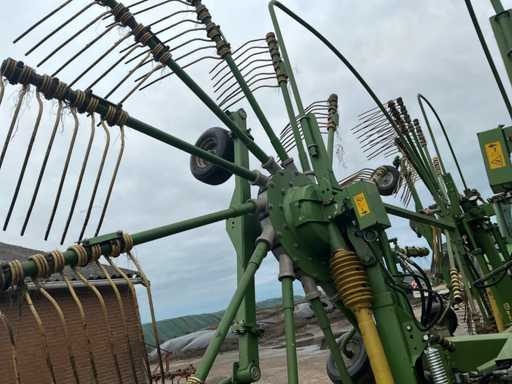 Équipé de : Le Krone Swadro 1400 Plus SW2E a une largeur de travail de 9,80 à 13,50 m, une largeur de bande de 1,40 à 2,20 m, 4 rotors avec 13 à 15 bras par rotor et 4 dents par bras, et une capacité pouvant atteindre environ 15 à 20 hectares par heure selon la culture et la vitesse de déplacement. Pistes de cames réglables, renouvelées en 2024.
