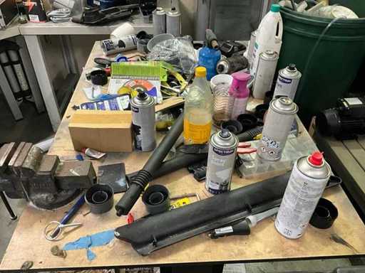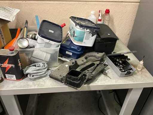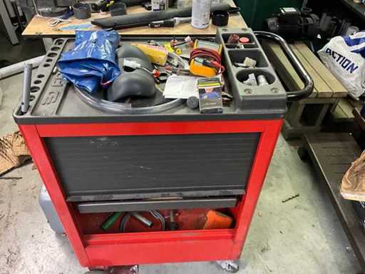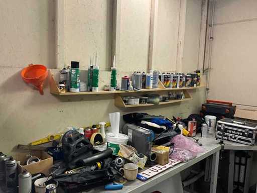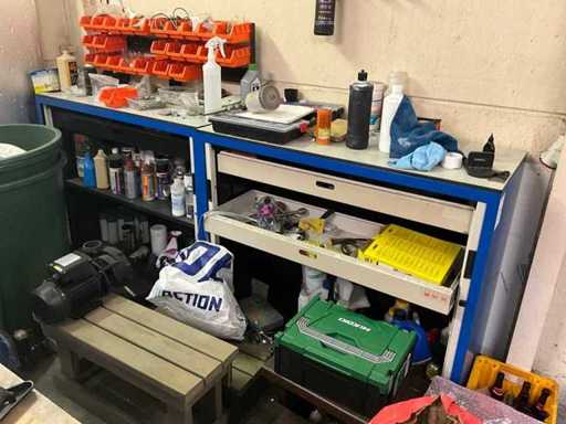 Composé d’un établi en forme de L de 300x200 cm, d’un meuble de rangement de 2x hauteur de 100 cm, d’une table de travail mobile +1x, d’un chariot matériau +1x Facom, TOUT AVEC DU CONTENU !, SAUF LE RÉFRIGÉRATEUR !!