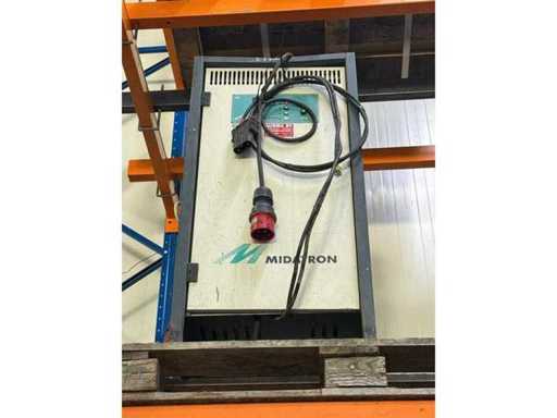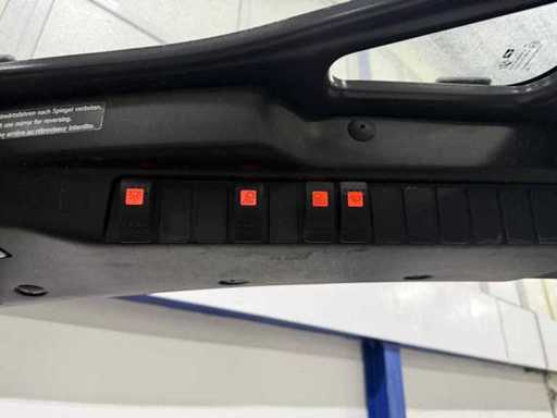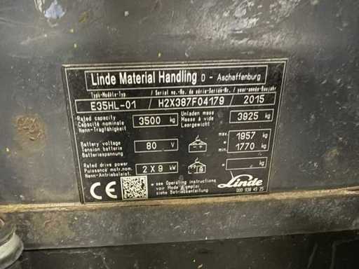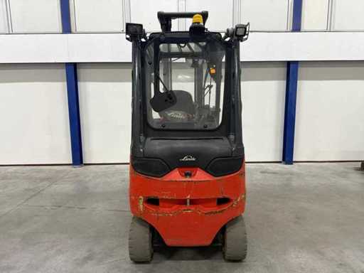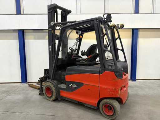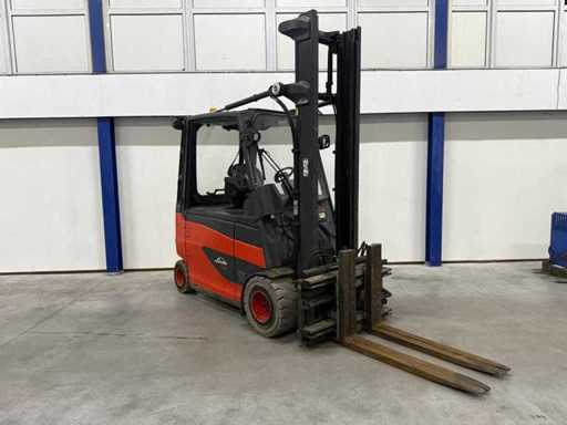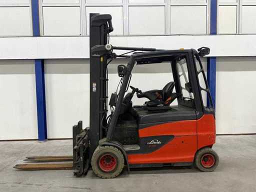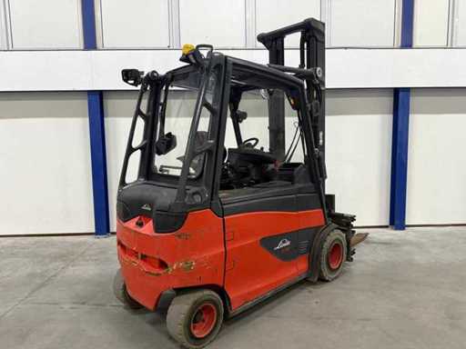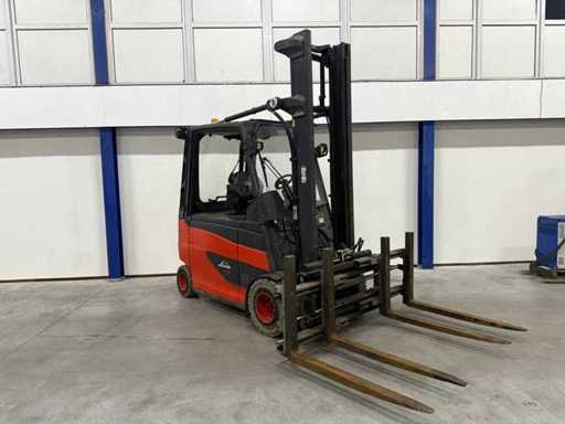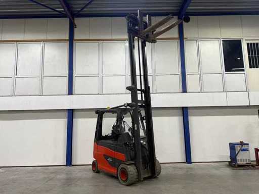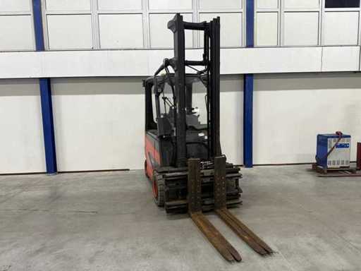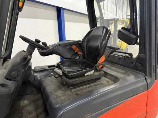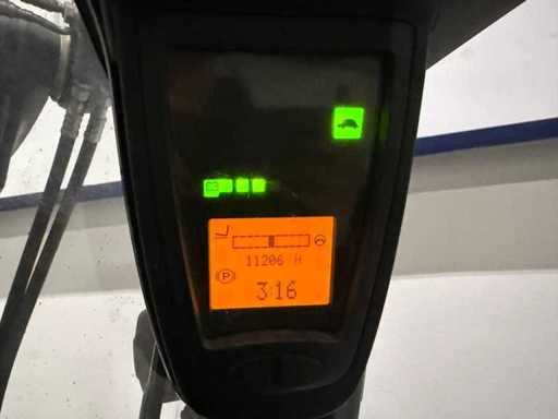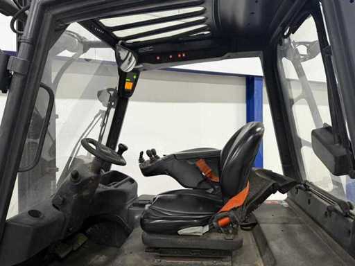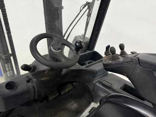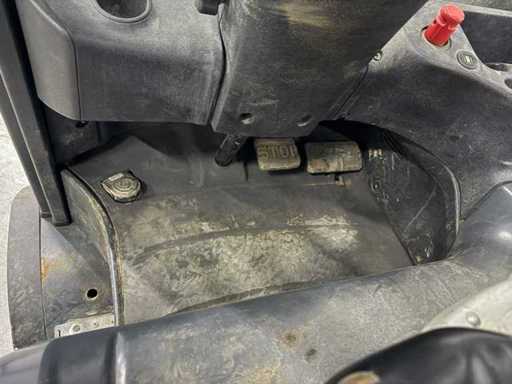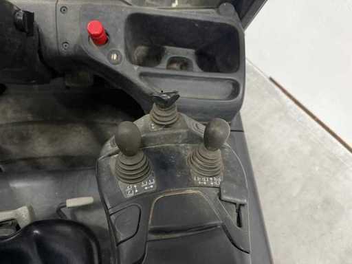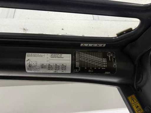 Équipé de : mât double, chargeur de batterie, pont libre, 4 fourches, levier latéral, feux de travail, feux d’alerte