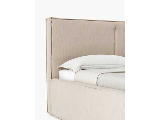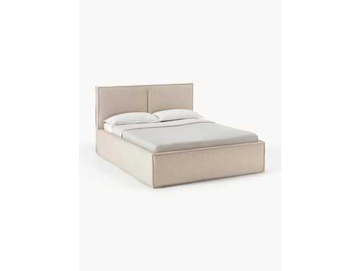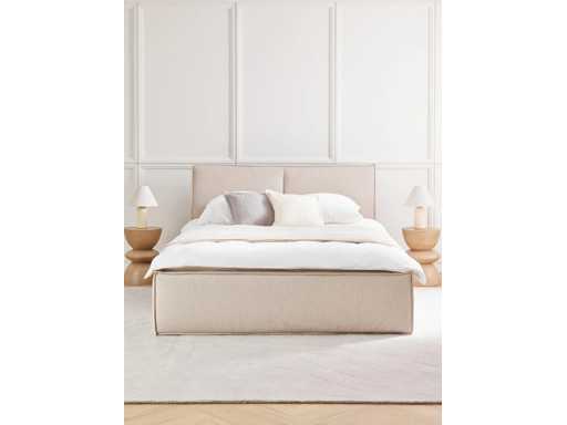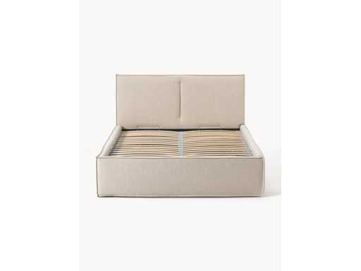 Couleur Beige Matière Revêtement : 100% polyester Le tissu obtient un score élevé de 35.000 au test d’abrasion Martindale, garantissant une durabilité exceptionnelle même en cas d’utilisation intensive. Revêtement : mousse, certifié CertiPUR™ Corps :bois d’épicéa massif, matériau du panneau Ce produit est fabriqué à partir de bois certifié FSC® provenant de sources durables. Surface du couchage : larg. 160 cm, long. 200 cm Dimensions globales : larg. 176 cm, long. 222 cm Tête de lit : larg. 176 cm, haut. 110 cm, prof. 14 cm Hauteur d'insertion du sommier : 4,5 cm Bord supérieur du cadre : haut. 40 cm Pieds : haut. 3 cm Dimensions intérieures de rangement : larg. 160 cm, haut. 33 cm, prof. 200 cm Ce qui y rentre habituellement : 2 couettes + 4 oreillers + 2 plaids Charge maximale : max. 300 kg (150 kg par côté)