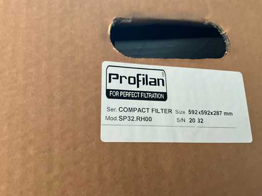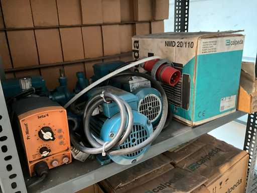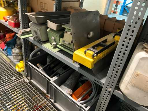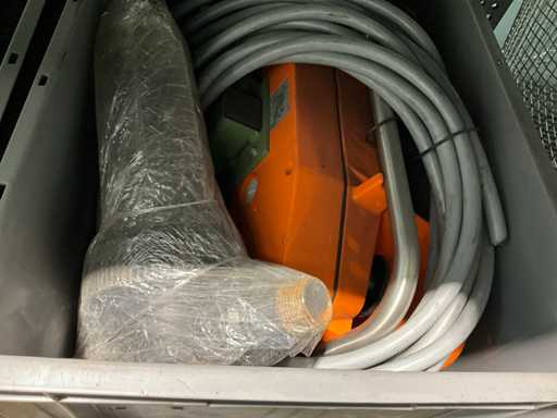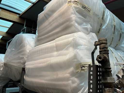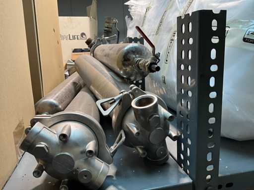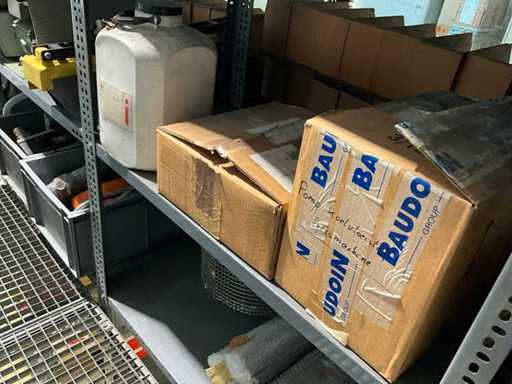 contenu à double rack composé d’anneaux de tension, de filtres compacts « Profilan », d’une pompe centrifuge, d’une pompe à liquide, de bidons d’huile, de toiles filtrantes, ... est sur le sol