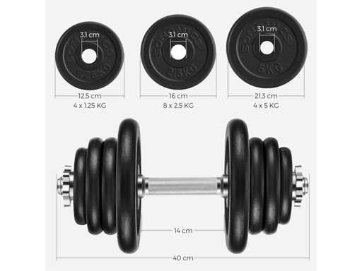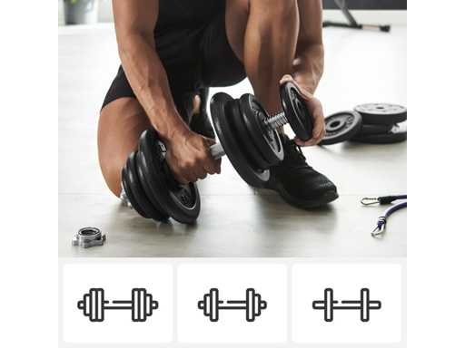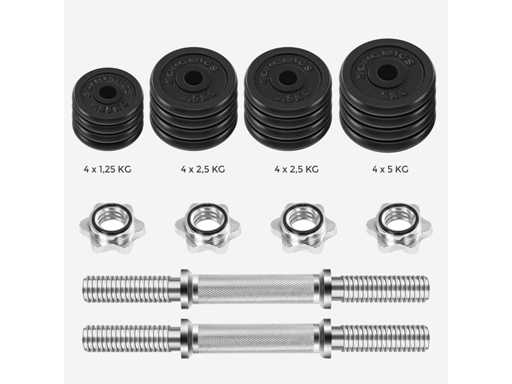 [Ce que vous obtenez] 50 kg au total (2 x 25 kg) : 4 x disque de 5 kg, 8 x disques de 2,5 kg, 4 x disques de 1,25 kg, 2 x barres, 4 x verrous. Livré en 2 colis