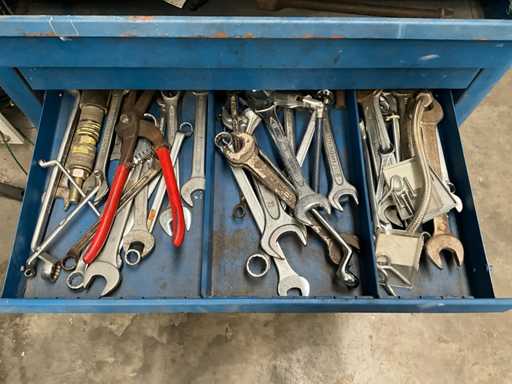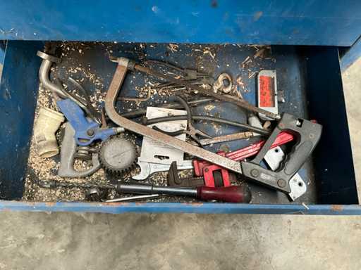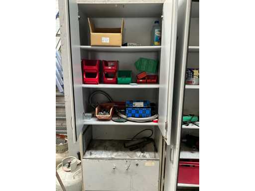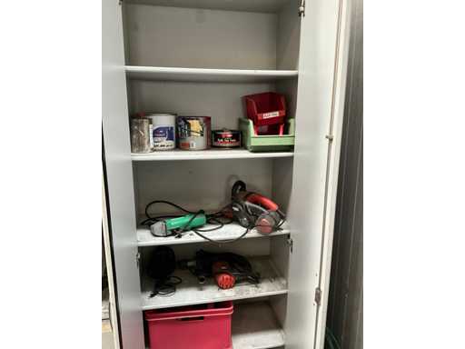 Composé de 2 armoires d’entrepôt avec contenu disques à tronçonner, fixations, peinture, perceuse + ponceuse à bande Black & Decker sur 220 volts, grignoteuse Hitachi CN16, armoire à matériaux avec diverses clés et douilles, etc.