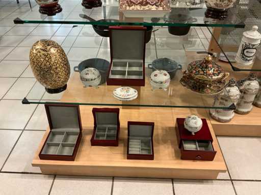 Comprenant 14x porcelaine chinoise incluant vases et pots, œufs avec piédestals, cendrier, soupière avec couvercle et bol, 5 boîtes à bijoux diverses