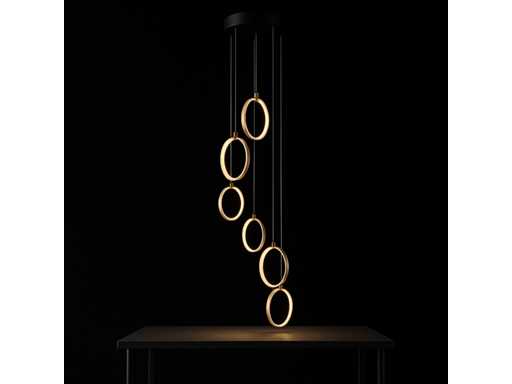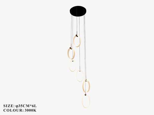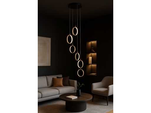Lumière suspendue LED modèle B069/6 – Température de couleur 3000K (blanc chaud) – Diamètre : 350 mm – Hauteur réglable – Lumière source : bande LED intégrée – Tension : 220-240V (50/60 Hz) – Kit de montage inclus – Idéal pour un usage intérieur : salons, chambres, bureaux ou espaces de vie – Garantie de 3 ans.