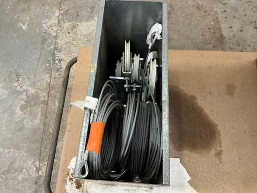 Composé d’une boîte en bois avec guirlandes d’éclairage de fête, + une boîte métallique avec câbles et rouleaux pour la porte renversée