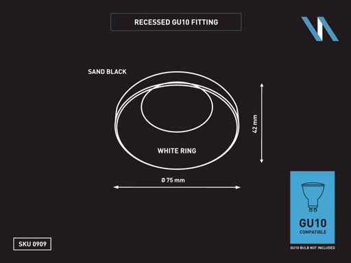 Scellement IP20, couleur produit sable blanc, noir, tamisé. Ø 73 x 42 mm, diamètre d’installation 63 mm, matériau en aluminium, raccord GU10, y compris porte-lampe en céramique, source lumineuse non incluse, adapté à l’intérieur, entrée d’ampoule unique, tension 220-240V, SKU 00909 SKU353