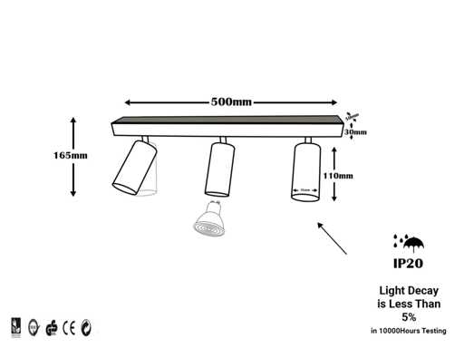 6 x luminaires de surface GU10 – 3 projecteurs pivotants – Couleur : Noir – Base : GU10 – Dimensions : 500 x 165 mm – Rotatif : rotation de 350° / inclinaison de 70° – Matériau : Aluminium de haute qualité – Tension : AC 85–265V (50/60Hz) – Degré de protection : IP20 – Application : Usage intérieur – Lampes : Non incluses – Kit de montage inclus – Idéal pour l’éclairage d’accent, de travail ou décoratif – Longue durée de vie et design haut de gamme.