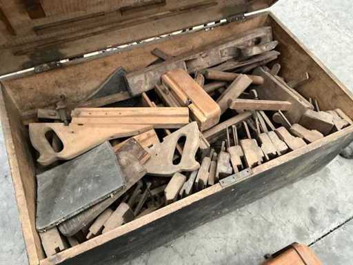 Composé d’une machine à coudre à pédales, d’une horloge murale, d’un boîtier avec des rabots anciens