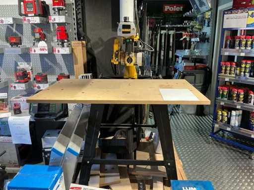Ce terrain composé de DeWALT DW721KN se trouve dans un showroom inutilisé avec une table assortie.