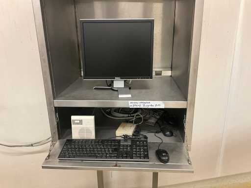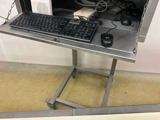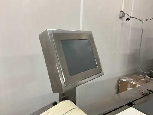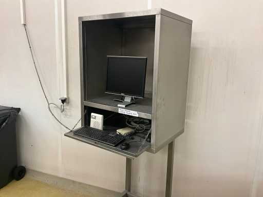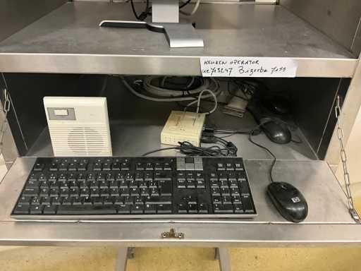 Machine d’impression et d’étiquetage en acier inoxydable BIZERBA, complète avec armoire opérateur mobile en acier inoxydable avec dim plm:80x80x215 cm, contenant prolongateur, écran, clavier et diverses souris, à démonter par le cuivre lui-même, située dans la salle 98