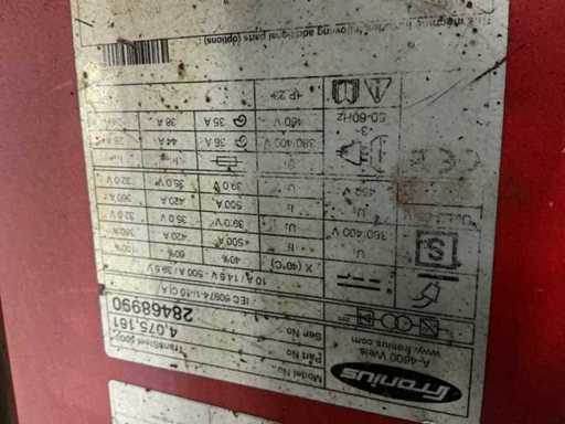 Équipé de : Pack intermédiaire 20e MiG refroidi par eau, Tension de connexion : 380/400/460 Volt, 50/60 Hz, 3phasé Tolérance de tension secteur : +/- 10 % Fusible secteur : 35 ampères. Doucement Zone de contrôle : 10 500 ampères. : 14,5 39,5 Volts Puissance sec. : 500 ampères. 40 % d’identification, 10 min., 400 °C Tension à vide : 65 Volts Classe de protection : IP 23 Dimensions LxEsque : 747 x 300 x 497 mm Poids (source d’alimentation) : 32,5 kg La machine est livrée prête à être soudée avec un ensemble standard d’accessoires : - câble de connexion primaire de 5 mètres 4x6 mm2, incluant la prise primaire 32Amp., 5p CEE - Alimentateur à fils VR 5000 yards 4R/W/FSC Synergique, incluant test gaz/alimenteur filaire - Rouleau de fil FSR U 1.2 (rouge), 4 pièces. requis, prix par pièce - Bras de montage VR 5000 yard - Châssis 4 roues Pick up 5000 TST - unité de refroidissement par eau modèle FK 5000 - Kit de conversion protection contre le débit d’eau + capteur thermique - kit de conversion pour filtre à eau de refroidissement FK 5000 - kit de conversion pour commande à douille VR 5000 - Garde avant VR 5000 - Pack intermédiaire W/10m/70 mm² pour VR 4000/5000/7000 - soupape de réduction de pression incluant un débitmètre - Chalumeau de soudage Fronius modèle MTW 400i /FSC/UD/4,5 m/45 LED - ensemble de pièces détachées MTW 400i,1,2