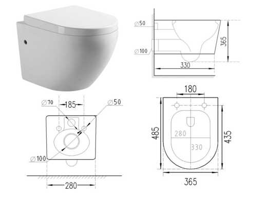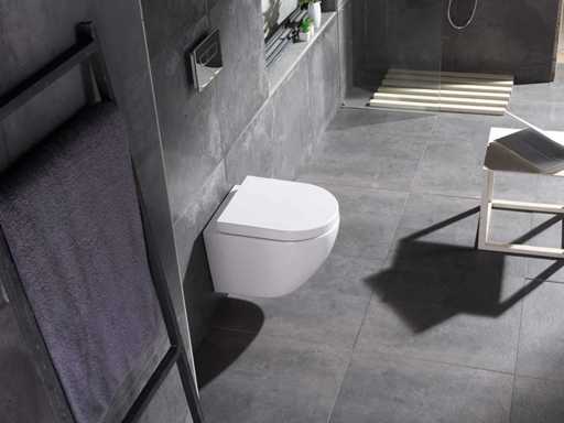 Dimensions lxbxh 49x37x37cm, matériau céramique et plastique, couleur blanc brillant, siège de toilette à fermeture amortie avec couvercle, vidange p-step, poids 30 kg, chasse d’eau sans bride (sans rebord de chasse), complet avec matériel de montage, universellement applicable à tout réservoir intégré, couvercle à dégagement rapide