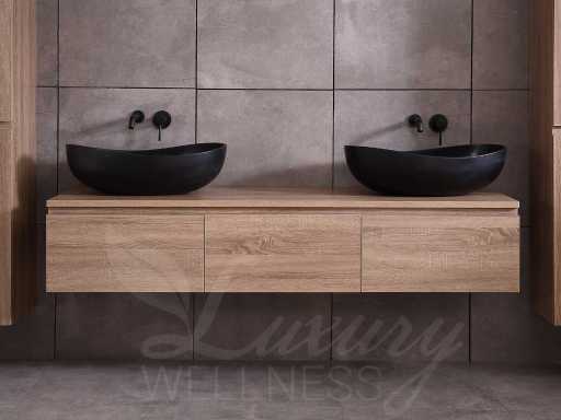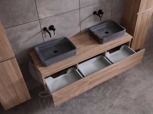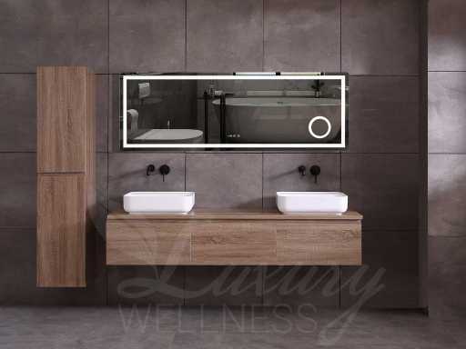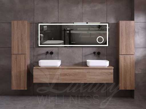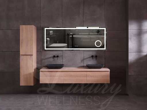 Dimensions Meuble bas au choix LxPxH 120x50x35cm ou 150x50x35cm ou 180x50x35cm - Meuble mural 35x35x160cm (livré avec 1 meuble mural), Couleur au choix chêne blanc lavé ou chêne gris fumé ou chêne brun (couleur de choix à transmettre par email sur info@mawialux.nl), Matériau Façade et dessus en chêne massif (dessus de 3cm d’épaisseur) et contreplaqué 5 couches (très solide et résistant à l’humidité), Porte d’armoire murale à fermeture douce et étagères supplémentaires (l’armoire murale peut être suspendue à gauche et à droite du meuble), robinets exclusifs, tiroirs 3 pièces avec fermeture douce, éviers en surface solide, en pierre naturelle ou en maarmer italien (choix de différents modèles parmi les 3 dernières photos, veuillez indiquer le choix le jour de la collecte), miroir miroir LED avec éclairage LED (diodes LED 6000K) / loupe / chauffage (anti condensation) / horloge avec écran tactile (peut également être échangé contre un miroir de luxe pour un petit supplément avec écran, Bluetooth et haut-parleurs, renseignez-vous ensuite le jour de la collecte), drains exclusifs, Condition : Nouveau dans la boîte, Caractéristiques spéciales Garantie de 2 ans, les trous ne sont pas pré-percés dans le haut, vous pouvez donc utiliser à la fois des robinets muraux et des robinets par le haut ou même 1 évier au lieu de 2 pièces (percer des trous par un installateur est facile à faire soi-même), complet avec kit d’installation, Très haute qualité, veuillez noter ! L’armoire murale peut être remplacée par un ensemble de robinets et d’évacuations escamotables de votre choix ou si vous avez besoin d’une armoire murale supplémentaire, veuillez l’indiquer le jour de la collecte pour une offre adaptée