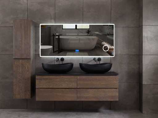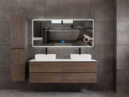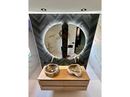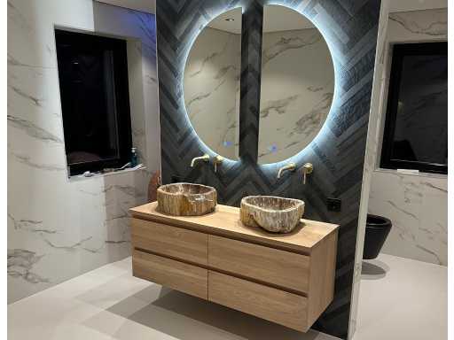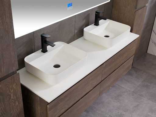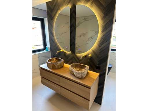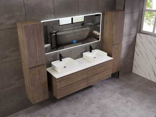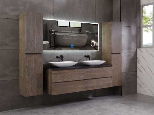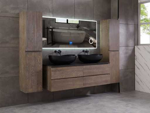 Dimensions du meuble LxPxH 140x50x50cm - Armoire murale 35x35x160cm, couleur Gris fumé ou chêne naturel (vous pouvez choisir 1 de ces 2 couleurs et indiquer votre choix par email sur info@mawialux.nl, matériau plateau en chêne massif 3cm + 2cm chêne massif (façade) et contreplaqué 5 couches (très solide et résistant à l’humidité), armoire suspendue portes à fermeture douce et étagères supplémentaires (l’armoire suspendue est universelle et peut être accrochée à gauche et à droite à côté du meuble), robinets exclusifs, tiroirs 4 pièces avec fermeture douce, éviers en pierre naturelle ou en surface solide (choix de différents modèles parmi les dernières photos, choix veuillez indiquer par email sur info@mawialux.nl), miroir LED miroir avec chauffage/bluetooth/radio/horloge et loupe avec éclairage LED tout autour à l’arrière avec 3 couleurs réglables LED 3000/4500/6000K LED diodes (lumière jaune/bleue/blanche) avec les options suivantes affichage numérique, miroir loupe intégré de 10 cm de diamètre avec éclairage LED (agrandit 3x), Bluetooth avec haut-parleur, horloge numérique, indication numérique de la température, prise 220 volts (plug and play), REMARQUE : Il s’agit d’une armoire de base avec un dessus solide de 3 cm comme la dernière photo, les autres photos ne sont qu’un exemple, veuillez noter ! L’armoire murale peut être remplacée par un ensemble de robinets et de drains escamotables de votre choix ou si vous avez besoin d’une armoire murale supplémentaire, veuillez l’indiquer pour une offre appropriée