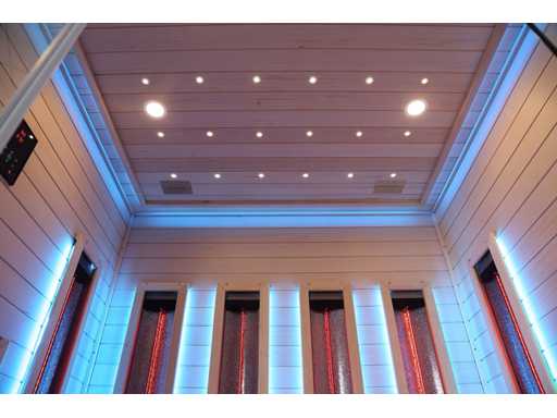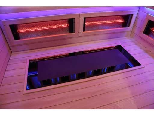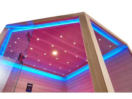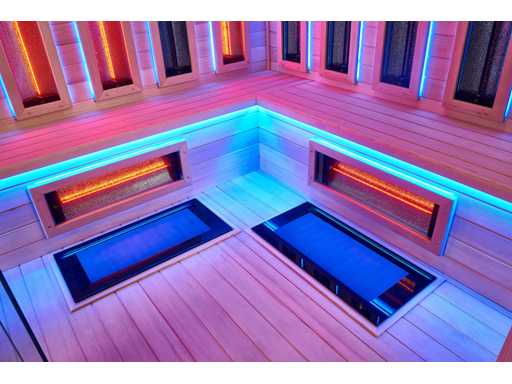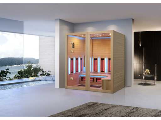 Vous pouvez choisir 1 des 3 modèles qui sont dans les images. image 1 : dimensions LxlxH 210x210x220cm, image 2 : image 3 : dimensions LxlxH 150x200x220cm, tous les saunas sont équipés de : verre de sécurité de 8 mm, panneau de commande numérique, Bluetooth avec haut-parleurs, total 14x panneaux infrarouges de 3000 watts chacun, y compris un poêle de sauna humide de 6kw, divers éclairages LED avec thérapie par la couleur (7 couleurs),