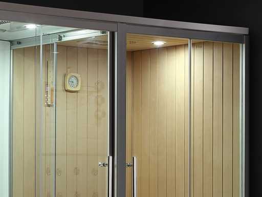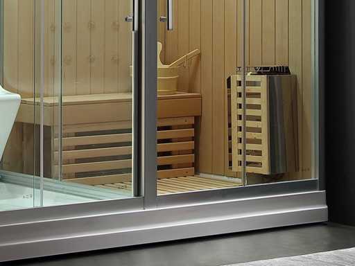Panneau de commande numérique, y compris vidange (avec pieds réglables en bas), robinet thermostatique, Bluetooth avec radio FM et haut-parleur, vidange avec tuyau d’eau flexible, chauffe-sauna 3000 watts, générateur de vapeur 3000 watts, puissance totale 220v 6000 watts 16a (avec prises plug and play), 16 jets de massage incorporés dans le mur du fond, télécommande, banc en bois de pruche adapté pour 2 personnes, seau avec cuillère, thermomètre sauna, sablier avec indication de l’heure, éclairage LED (4 pièces au plafond), double acrylique intégré dans le panneau arrière de la cabine à vapeur (adapté pour 2 personnes), poignées de porte en acier inoxydable (chromées), aromathérapie, indication numérique de la température, extraction avec ventilateur, ozone, pression de l’eau réglable, douchette, étagère, porte-serviettes, fonction déodorateur, robinet en laiton chromé, 3 portes coulissantes (également une porte entre sauna/zone de vapeur), Douche à effet pluie au plafond, panneau de commande numérique avec écran tactile, douchette à main