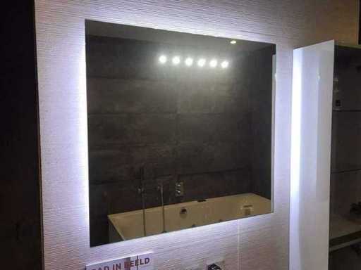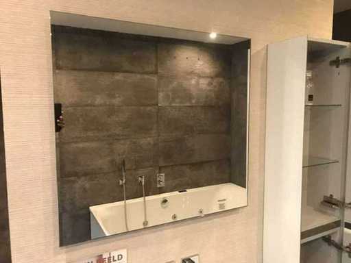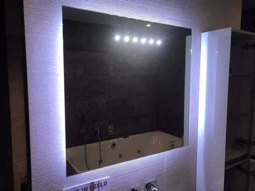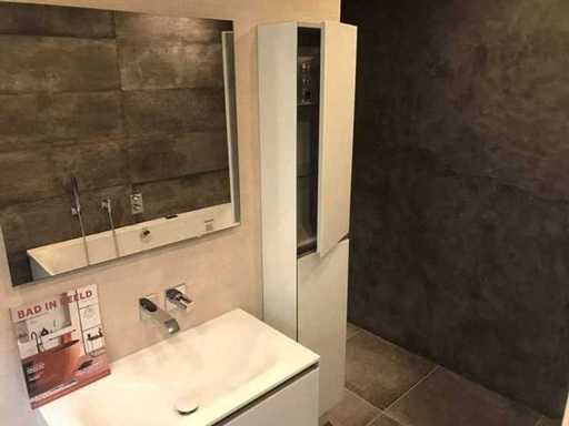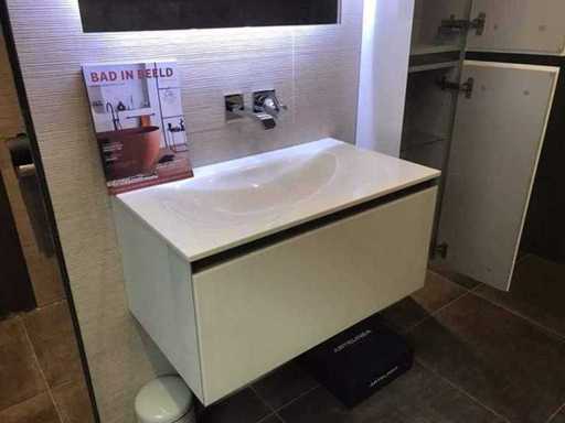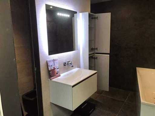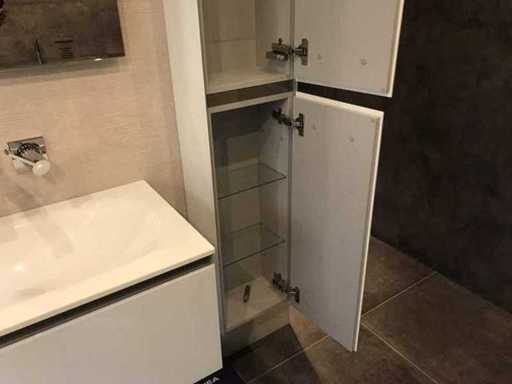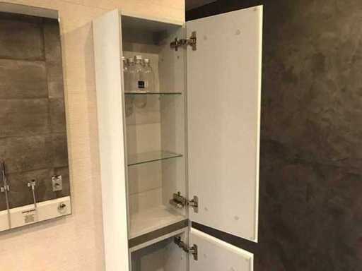 Montrez le modèle d’unité de meuble avec meuble de base, évier, miroir et meuble haut. Taille du meuble du lavabo 75x44x37 cm. Grande taille d’armoire, tournage à droite 30x20x160 cm. Taille du miroir LED 75x70 cm. Le matériau de l’évier est du verre, couleur blanc brillant. Les façades des meubles sont en verre et en blanc brillant
