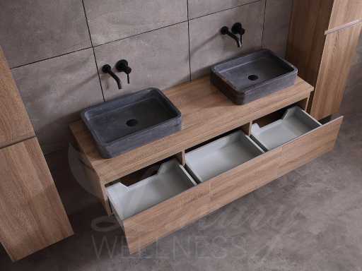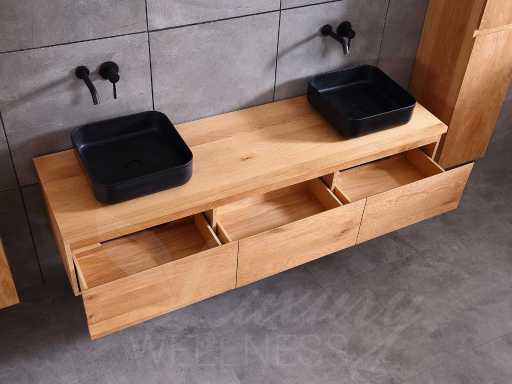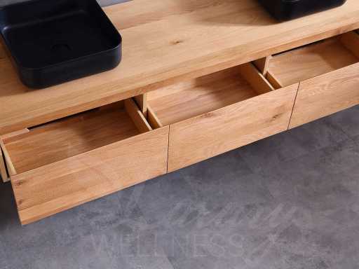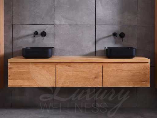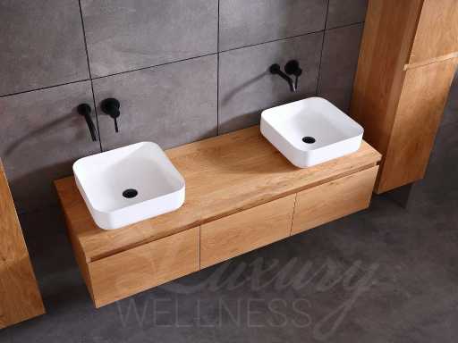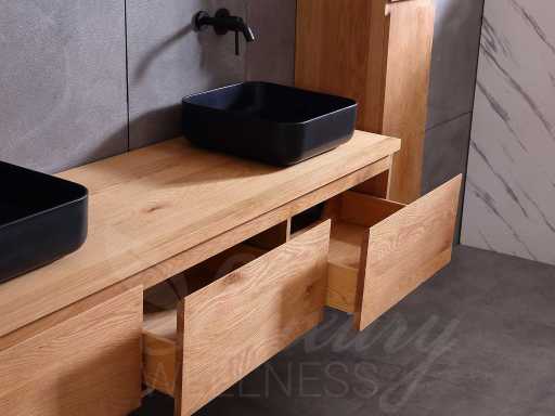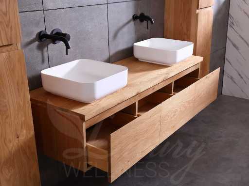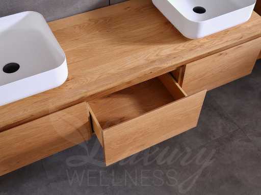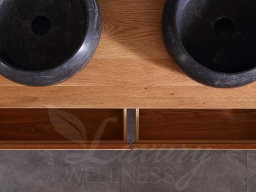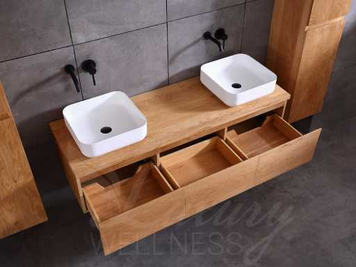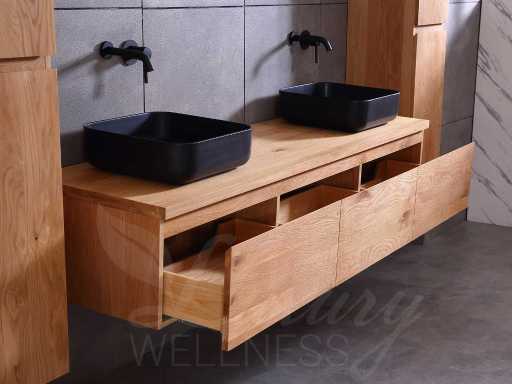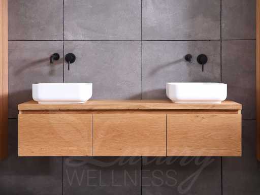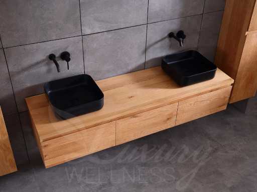 Dimensions du meuble lxpxh 180x50x35cm - armoire suspendue 35x35x160cm, Couleur chêne naturel ou blanc lavé ou chêne gris fumé ou brun, Matériau façade et plateau en chêne massif (dessus de 3cm d’épaisseur) et contreplaqué 5 couches (très solide et résistant à l’humidité), Porte à fermeture douce et étagères supplémentaires (l’armoire suspendue peut être suspendue à gauche et à droite du meuble), Robinetterie exclusive, Tiroirs 3 pièces avec fermeture amortie, Éviers en surface solide, pierre naturelle ou marbre italien, Miroir led miroir avec éclairage led (diodes led 6000K )/loupe/chauffage (anti-condensation)/horloge avec écran tactile, Drains exclusifs, État : neuf dans la boîte, Caractéristiques spéciales Garantie de 2 ans, les trous ne sont pas pré-percés dans le haut, vous pouvez donc utiliser à la fois des robinets muraux et des robinets du haut ou même 1 évier au lieu de 2 pièces (percer des trous par un installateur est facile à faire vous-même), complet avec kit d’installation, de très haute qualité, Veuillez transmettre le choix de la couleur sur info@mawialux.nl