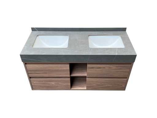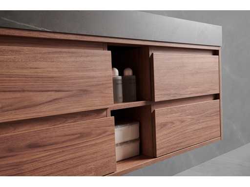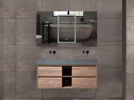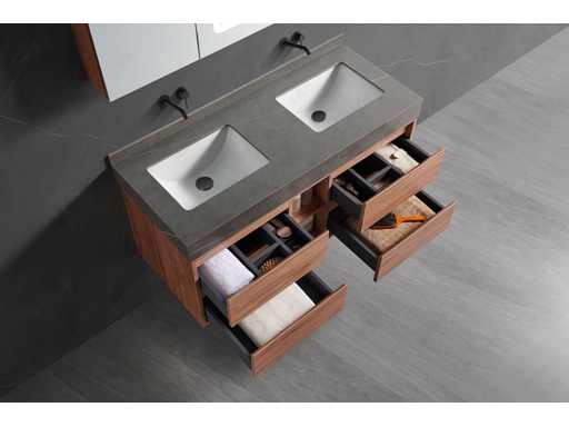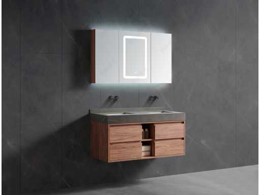 Meuble bas LxPxH 120x48x50cm - Armoire de toilette LxPxH 120x10x70cm - Évier LxPxH 120x50x10cm, Couleur noyer brun, Matériau 2cm Contreplaqué 5 couches (très solide et résistant à l’humidité) avec couche supérieure en mélamine, Robinets non inclus, Tiroirs 4 pièces avec fermeture amortie, L’évier se compose de pièces plates en pierre frittée avec 2 plateaux en céramique blanche en dessous (l’évier est livré en standard sans trous de robinet mais vous pouvez le percer par la suite afin que vous puissiez utiliser des robinets par le haut si c’est votre préférence Armoire de toilette avec éclairage LED et chauffage (anti-condensation), complète avec matériel d’installation, Drains et robinets non inclus, Condition : Nouveau dans la boîte, Caractéristiques spéciales Garantie de 2 ans, livraison à domicile gratuite aux Pays-Bas et en Belgique (en dehors de cela, peut être livré moyennant un coût supplémentaire).