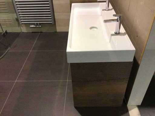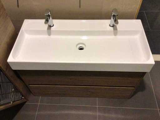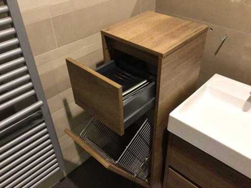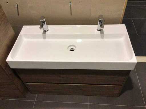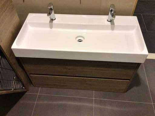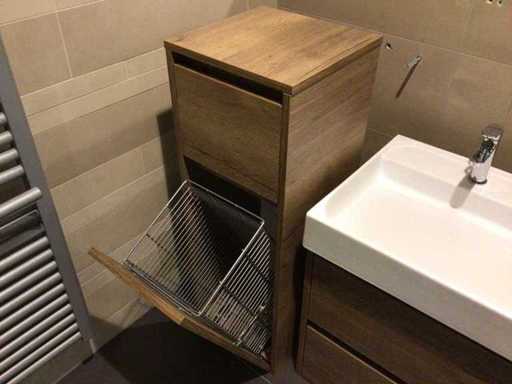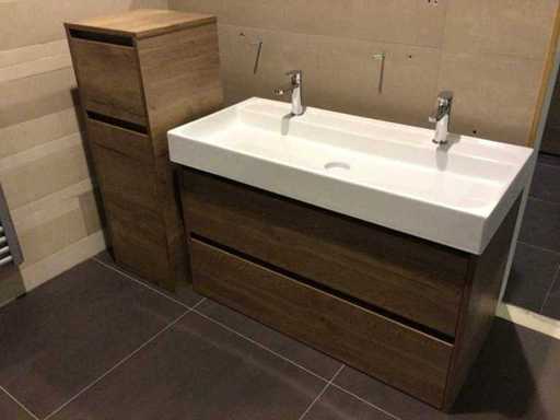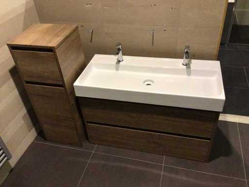 Modèle de salle de bain avec évier en céramique 101x46x10 cm blanc brillant avec 2 trous de robinet, meuble de base avec 2 tiroirs 100x45x56 cm, meuble en chêne de couleur tabac et mi-hauteur avec tiroirs et porte avec panier à linge 35x96,8x35 cm en chêne de couleur tabac