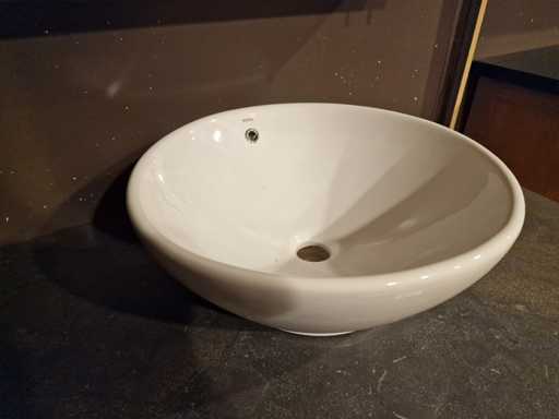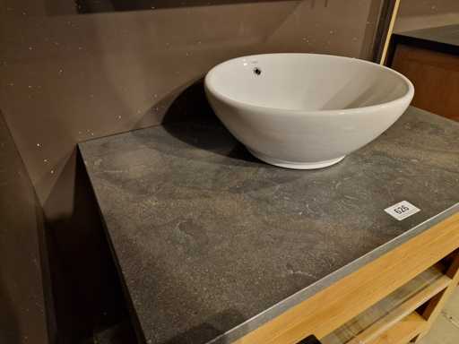 Mobilier de salle de bain en teck Erica 95 cm avec pierre bleue - lavabo en porcelaine rond - teck de qualité A avec étagère en verre et 2 paniers en herbiers marins