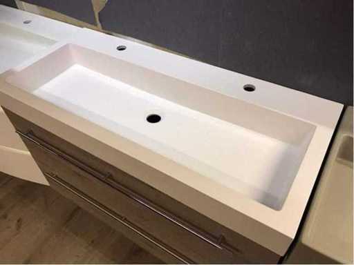 Montrez le modèle d’unité de meuble avec meuble de base et évier. Armoire lavabo avec 2 tiroirs de taille 100x45x52 cm. Taille de l’évier 100x45x10 cm avec 2 trous de robinet. Le matériau de l’évier est en polystone et couleur blanc brillant. Armoire de base couleur gris cendre et équipée de poignées.