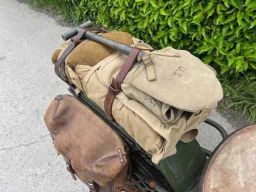 Selle d’origine, sacoches, sac de fusil, compteur, interrupteur, bougies d’allumage de Harley-Davidson, badge d’identification sur le char (très rare), sac à dos, pelle, et même les bandes militaires d’origine estampillées Militaire !