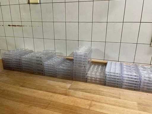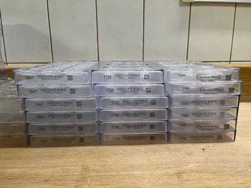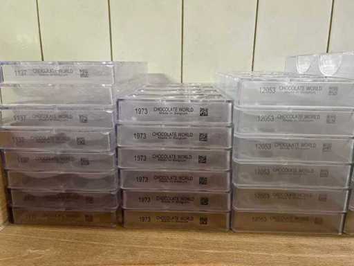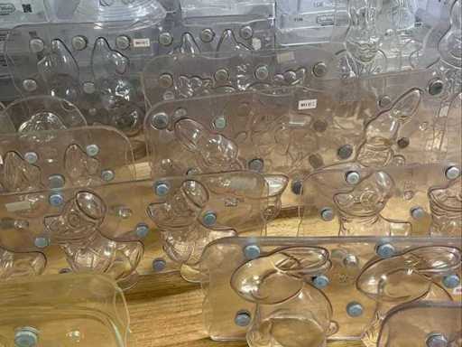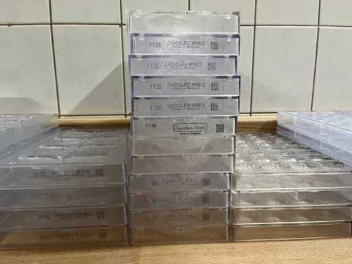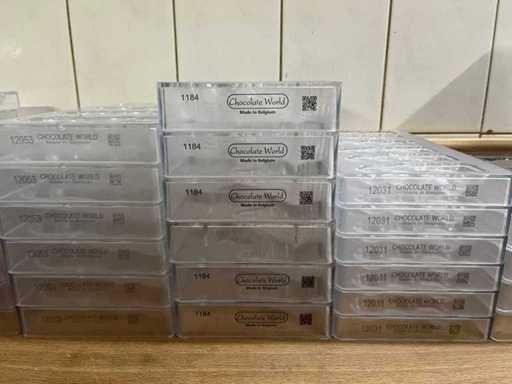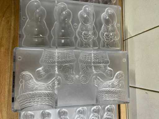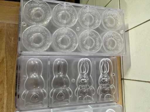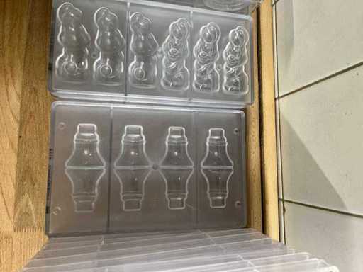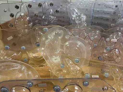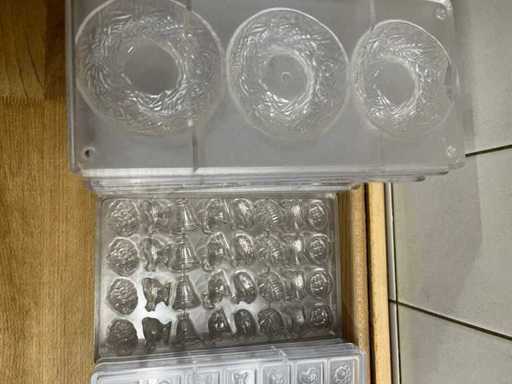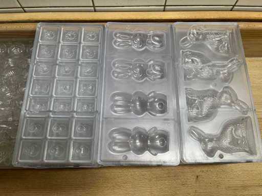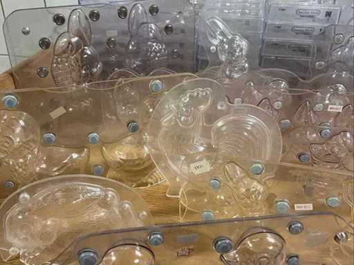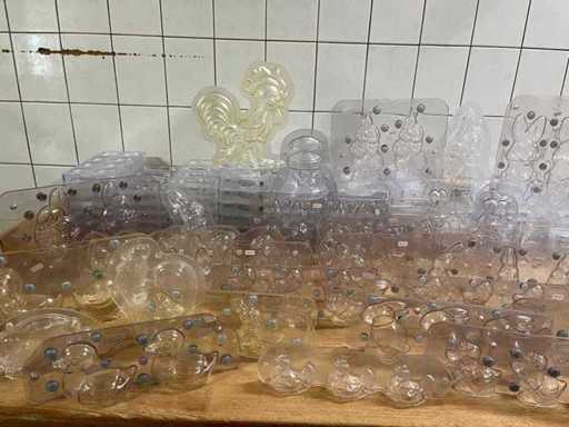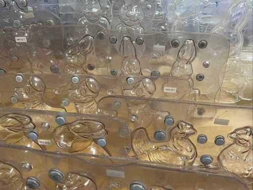 Un lot très vaste et professionnel de moules en chocolat en polycarbonate pour la fabrication de figurines creuses en chocolat, avec un accent sur les thèmes de Pâques (lapins, canards, poulets, cloches, etc.). Ce lot se compose de : ±40 formes pour figures creuses ±70 formes de cadres pour les figurines creuses de Pâques Je viens d’un environnement professionnel (chocolatier/boulangerie). ⭐ Caractéristiques principales Matériau : polycarbonate de haute qualité (qualité professionnelle) Marque : principalement Chocolate World (fabriqué en Belgique) - Application : adaptée à la fabrication de figurines creuses en chocolat - Type de formes : Formes en deux parties et cadres - Figures telles que : lapins, canards, poules, coqs, horloges, etc. - Indication de température : par exemple « MAX 65°C » visible sur plusieurs formes - État : utilisé, en bon état visuel (signes d’usure possibles)
