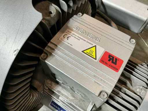 Comprend : Nash Elmo (Siemens), type : G 200 – 2BH1510-7HH56, souffleur à canal latéral / pompe à vide, transport d’air et de gaz non agressifs, applications à vide et surpression, classe de protection : IP55, classe d’isolation : F, moteur électrique triphasé selon la norme EN 60034, 50 Hz, puissance : 4,0 kW, vitesse : 2920 min⁻¹, tension 200–240 V Δ / 17,4 A, 345–415 V Y / 10,0 A, plage de pression sous vide : jusqu’à -350 mbar, Surpression : jusqu’à +440 mbar.