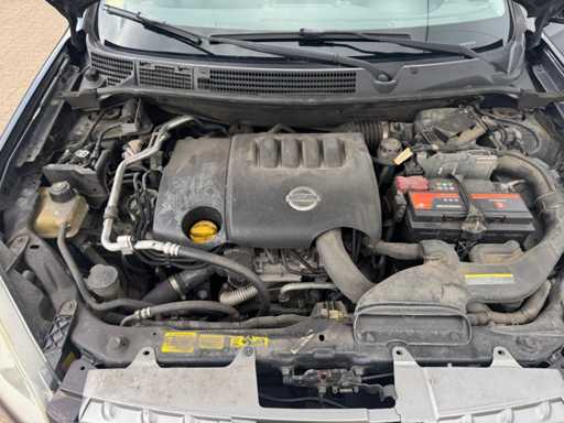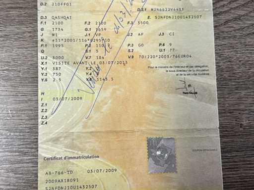 Nissan Qashqai 2.0 dCi (1995cc, 150 ch) avec climatisation. Commencez par le booster. Des journaux français disponibles, la vignette 705 peut être incluse. Dommages mineurs (capot bossé, rayures, peinture) et siège conducteur endommagé. Valise et intérieur autrement bien rangés.