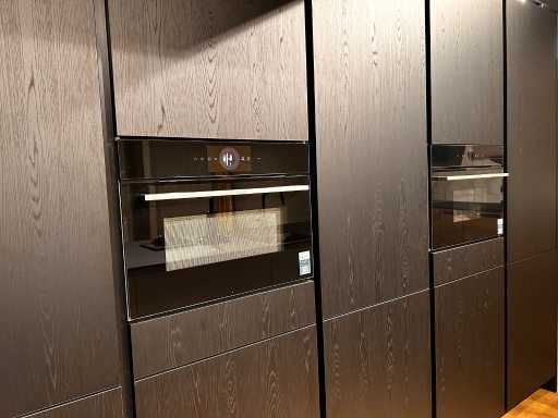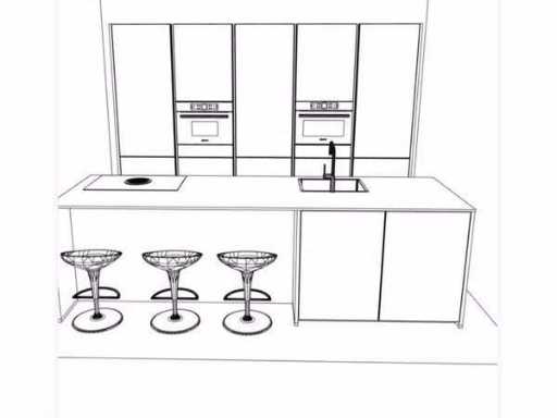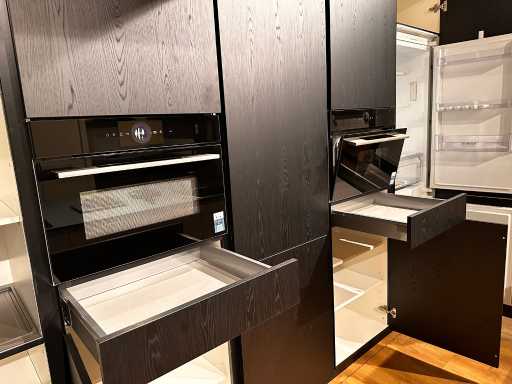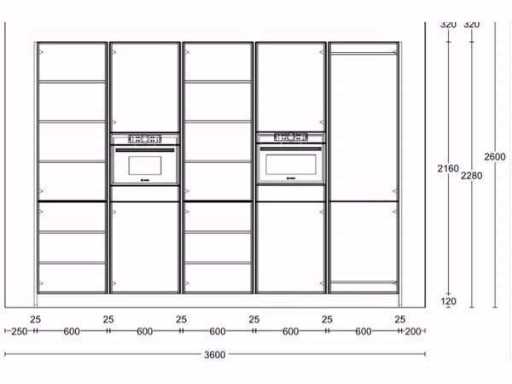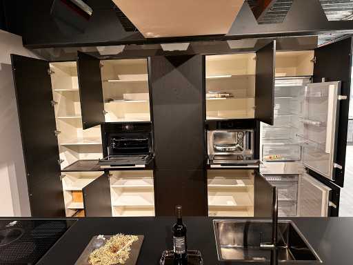 Veuillez noter ! disposition des îlots blanc mat ; Grandes armoires Structura Decor Oak Nero ; Fourgon à induction Bora GP4U 76 cm 4 zones avec système d’extraction ;