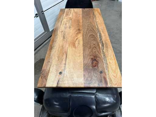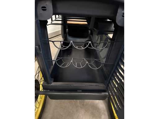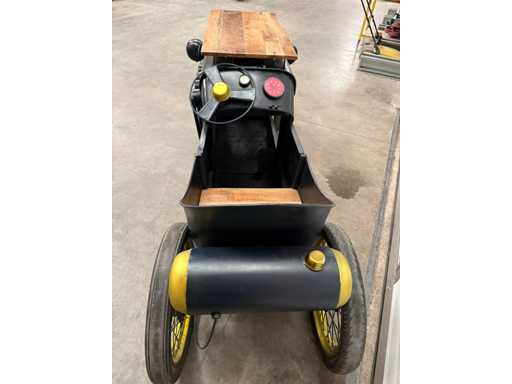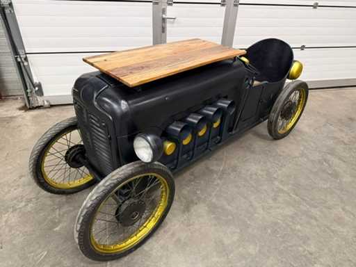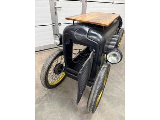 Voiture classique comme meuble de bar, métal avec accents en bois, roues à rayons