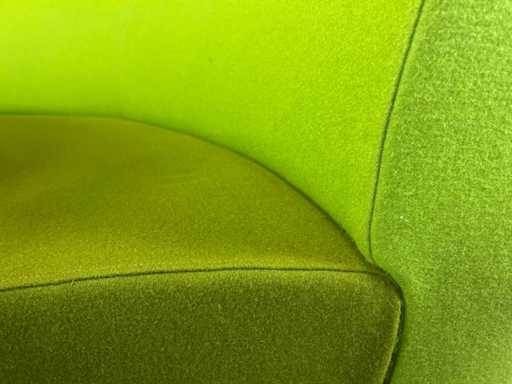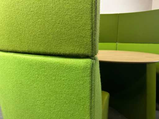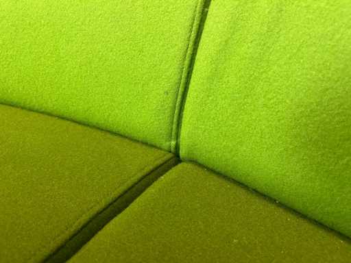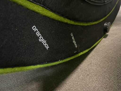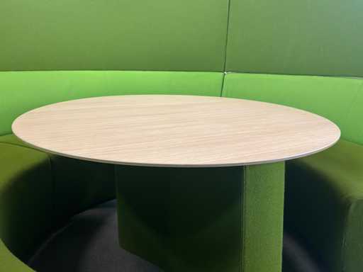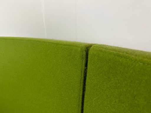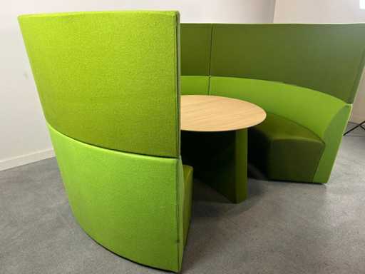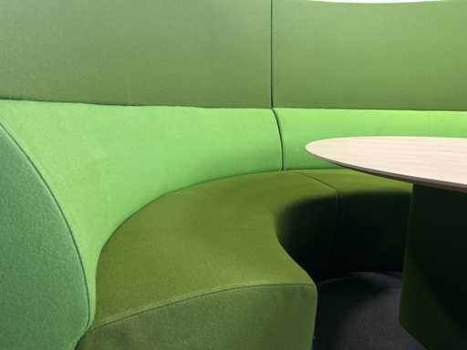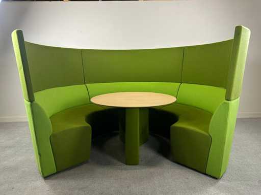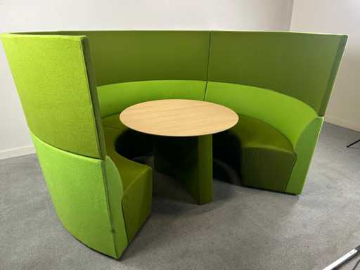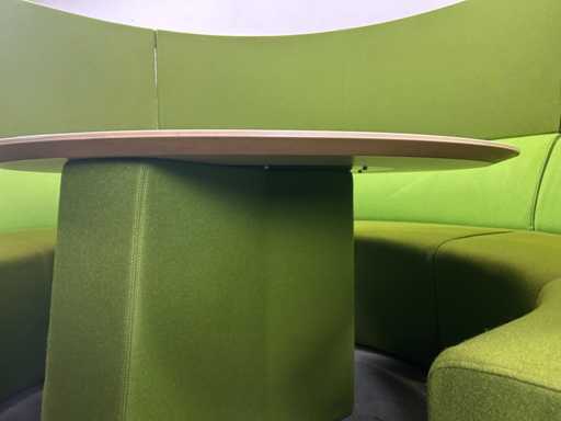 Cabine ronde d’intimité en tissu vert avec boîte orange, équipée d’une table centrale (ø120x71). La cabine a un diamètre de 275 cm à une hauteur de 150 cm, avec une profondeur de 240 pieds du côté ouvert. Quelques signes d’usure mais globalement en bon état.