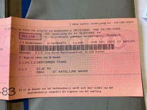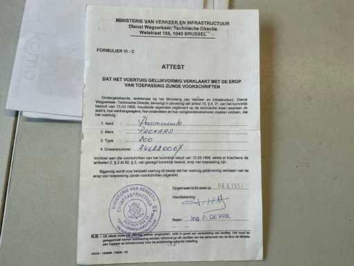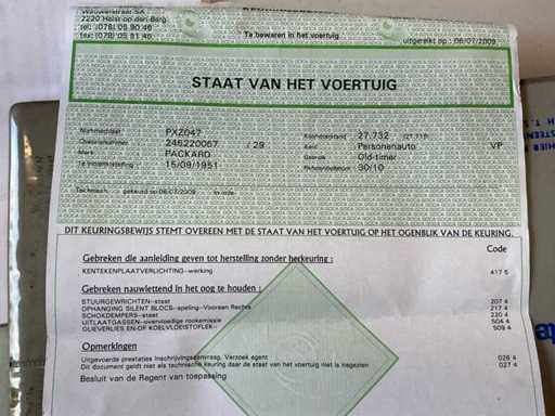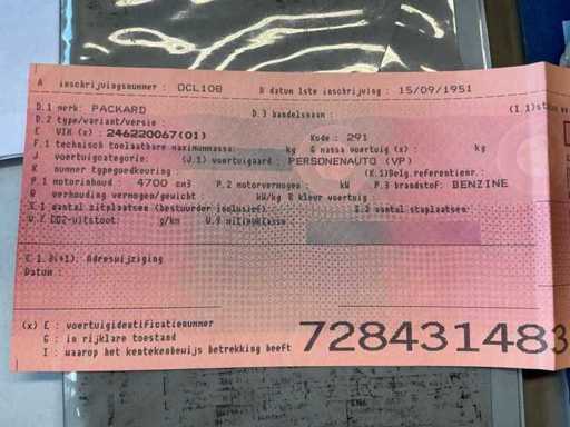 La voiture a été immatriculée pour la première fois le 15 septembre 1951 et possède une immatriculation de voiture classique belge. Le numéro de châssis 246220067 correspond à une berline Packard 200 Deluxe de la 24e série. Le kilométrage est de 27 804 miles (lire la lecture).