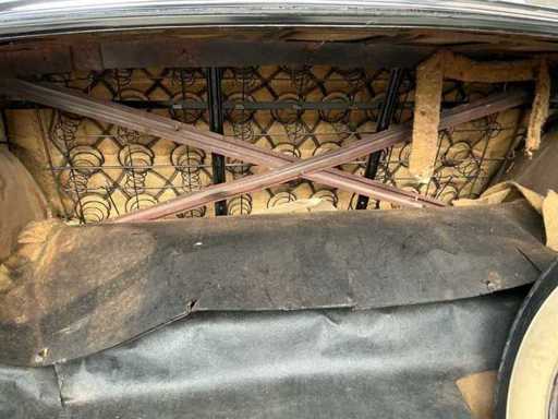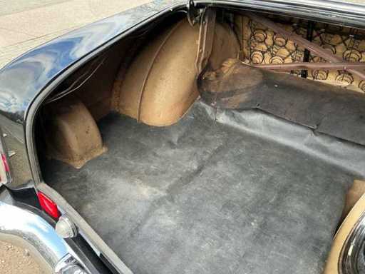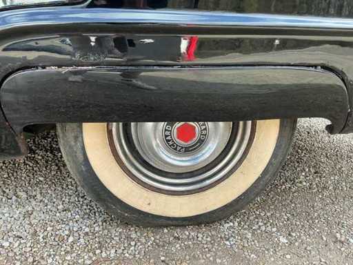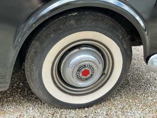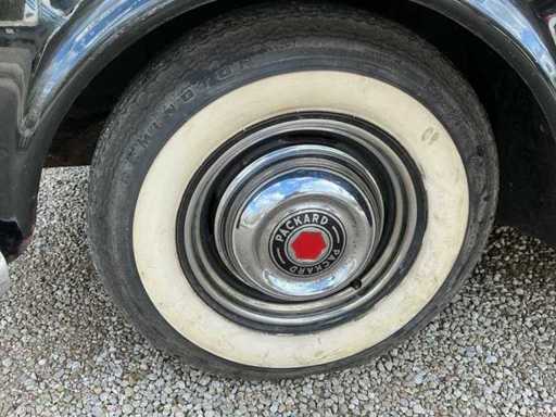 La voiture se présente dans une carrosserie noire avec des accents chromés, des pneus classiques à flanc blanc et des enjoliveurs Packard d’origine. L’intérieur comprend des banquettes en tissu à l’avant et à l’arrière, un tableau de bord classique avec instruments ronds et une boîte manuelle à levier de vitesses sur colonne, typique des berlines américaines de cette époque. En version Deluxe, ce modèle offre une finition plus riche et des détails supplémentaires.