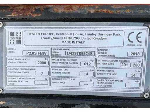 Palet à palette électrique Hyster P2.0S FBW 2018
