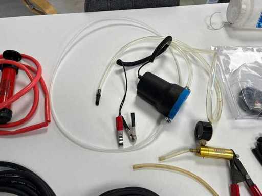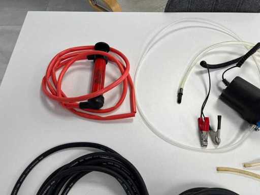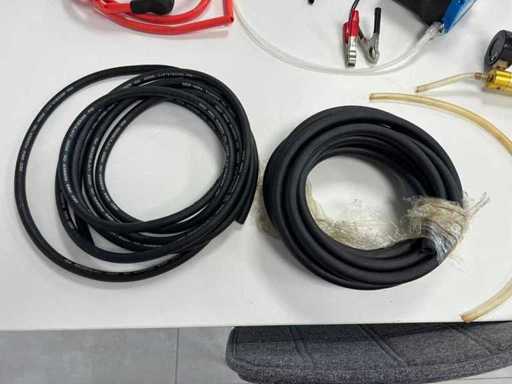 Beaucoup de matériel de travail pour un usage dans le garage. Contient divers tuyaux en caoutchouc à essence et huile (rouleaux et pièces lâches), une pompe manuelle à fluide, une pompe à fluide électrique (12V), des tuyaux transparents et des accessoires. La vente dans son ensemble, visible sur les photos (seul ce qui est sur la photo est dans le colis !) Matériau utilisé, non testé.