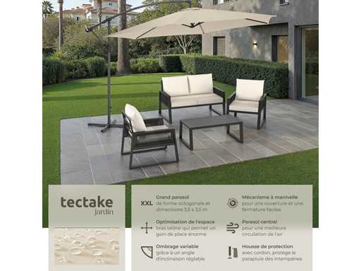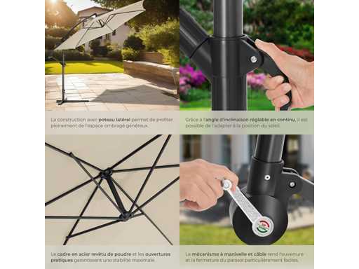 Protection contre les UV. Parasol excentré : 3,5 m de diamètre. L'angle d'inclinaison du parasol est orientable en continu. Ouverture et fermeture par manivelle. Coloris : Structure grise Petites ouvertures d'aération (à 20 cm de la pointe). Housse de protection incluse avec cordelette de serrage pour fixation. Pied : 1 x 1 mètre. Hauteur parasol déplié : 2,60 m. Hauteur parasol fermé : 2,90 m. Diamètre du tube : 5,4 cm. Diamètre du parasol : 3,5 m. Poids : 12,5 kg. Matériaux : Structure : métal Toile : 100% Polyester. 1 Parasol. 1 Base parasol. 1 Pied parasol.
