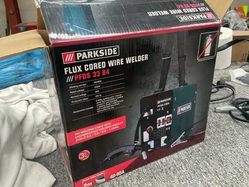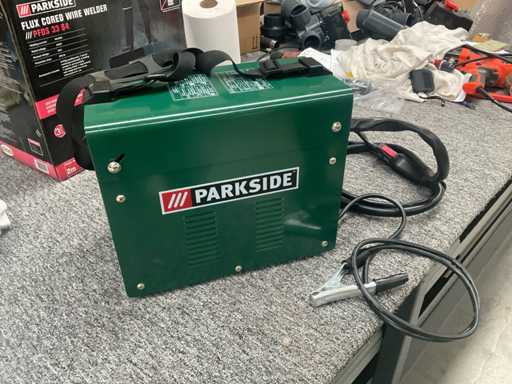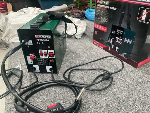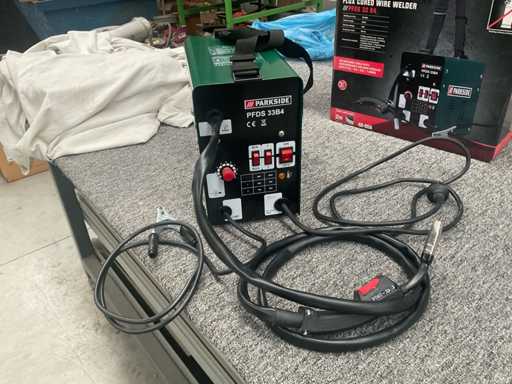 Poste à souder PARKSIDE PFDS 33 B4 en très bon état général, complet avec ses câbles, torche, pince de masse et accessoires. Modèle compact et simple d’utilisation, fonctionnant avec du fil fourré (sans gaz). Appareil testé, fonctionnement correct.