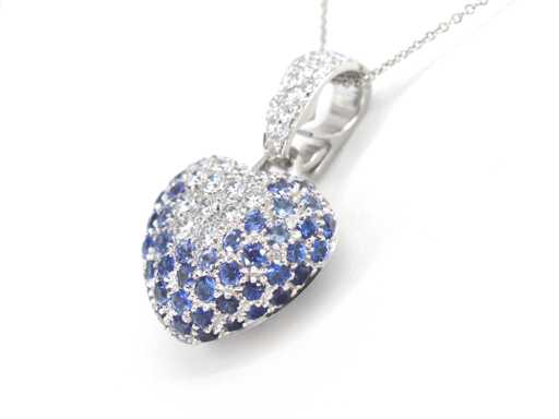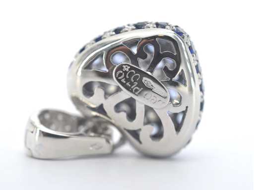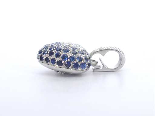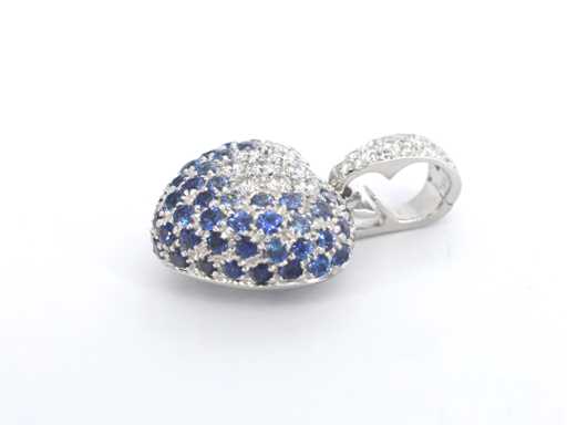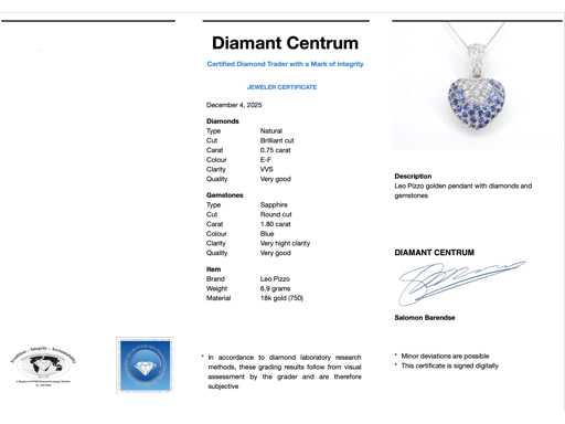saphirs Diamant : naturel ; Quantité : 33 pièces ; Coupe : Coupe brillante ; Poids (carat) : 0,75 carat ; Couleur : E-F ; Pureté : VVS ; Qualité de la coupe : Très jolie ; Pierre précieuse : Saphir ; Quantité : 60 pièces ; Coupe : Coupe ronde ; Poids (carate) : 1,80 carat ; Couleur : Bleu ; Pureté : Très haute pureté ; Coupe : Très bien ; Bijou : pendentif (hors collier) ; Marque : Leo Pizzo ; Poids : 6,9 onces ; Matériau : or 18K (750) ; État : Neuf ; Emballage : Boîte à bijoux de luxe ; Explication : La qualité a été prise du rapport correspondant à l’article. L’évaluation est une évaluation d’un négociant certifié en diamants, basée sur les prix à la consommation ; Prix à la consommation : 11 200 €
