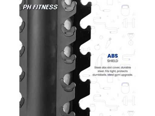 Un total de 10 haltères peuvent être stockés de chaque côté. En bas, les haltères plus lourds, et en haut les haltères plus légers. Les haltères reposent sur un profil en plastique, ce qui évite les dommages au manche.