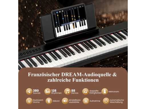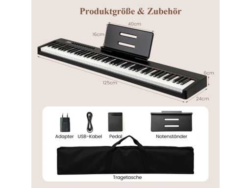 Couleur : Noir Matériau : PS + ABS Dimensions hors tout : 125 x 24 x 6 cm (L x l x H) Dimensions de la table de conférence : 40 x 16 cm (L x l) Poids net : 5,5 kg Contenu de l'emballage : 1 x Clavier de piano 1 x Pupitre 1 adaptateur 1 x Pédale 1 câble USB 1 x sac de transport 1 x Manuel d'utilisation