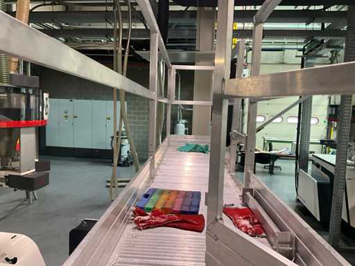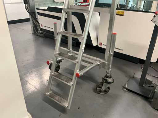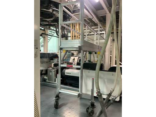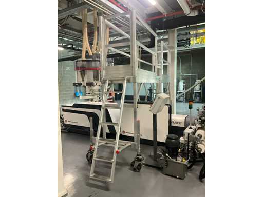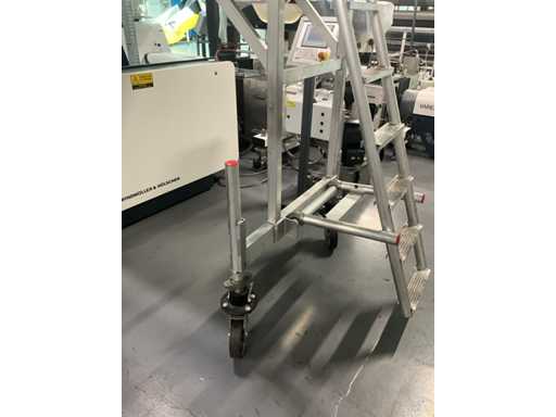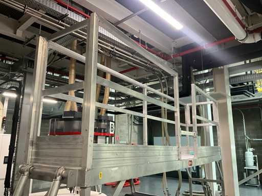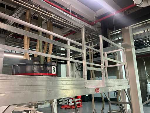 Mobile et en version inox, taille de la passerelle : 70 cm de large, équipée de garde-corps/clôture de sécurité et d’une ouverture de marche au milieu le long d'1 côté long avec verrouillable et le long d’un portail latéral court sur l’escalier d’étage RS5 avec 6 marches à 70°.
